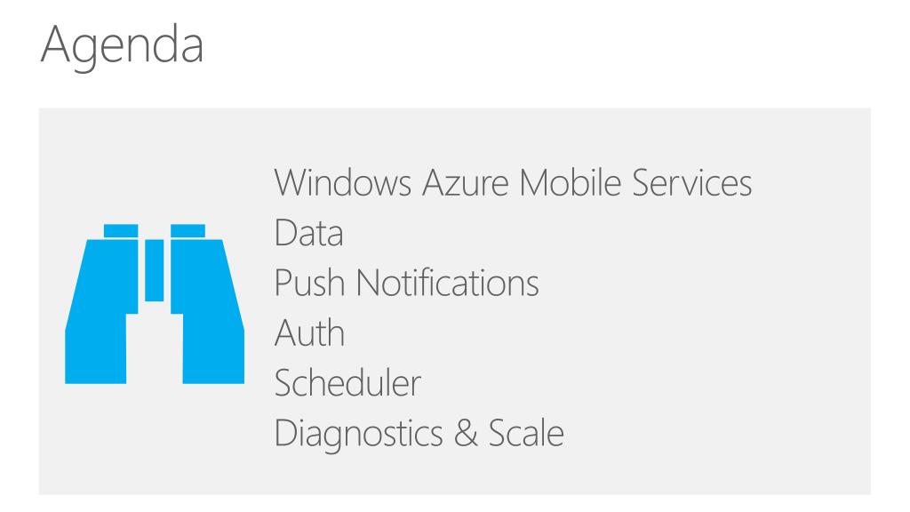 Agenda Windows Azure Mobile Services Data Push Notifications Auth Scheduler Diagnostics & Scale