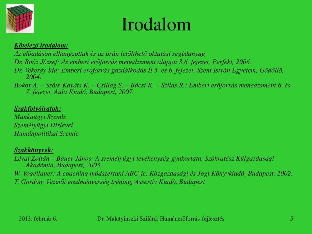Irodalom Kötelező irodalom: Az előadáson elhangzottak és az órán letölthető oktatási segédanyag Dr. Roóz József: Az emberi erőforrás menedzsment alapjai 3.6. fejezet, Perfekt, 2006. Dr. Vekerdy Ida: Emberi erőforrás gazdálkodás II.5. és 6. fejezet, Szent István Egyetem, Gödöllő, 2004. Bokor A. – Szőts-Kováts K. – Csillag S. – Bácsi K. – Szilas R.: Emberi erőforrás menedzsment 6. és 7. fejezet, Aula Kiadó, Budapest, 2007. Szakfolyóiratok: Munkaügyi Szemle Személyügyi Hírlevél Humánpolitikai Szemle Szakkönyvek: Lévai Zoltán – Bauer János: A személyügyi tevékenység gyakorlata, Szókratész Külgazdasági Akadémia, Budapest, 2003. W. Vogellauer: A coaching módszertani ABC-je, Közgazdasági és Jogi Könyvkiadó, Budapest, 2002. T. Gordon: Vezetői eredményesség tréning, Assertív Kiadó, Budapest Dr. Malatyinszki Szilárd: Humánerőforrás-fejlesztés