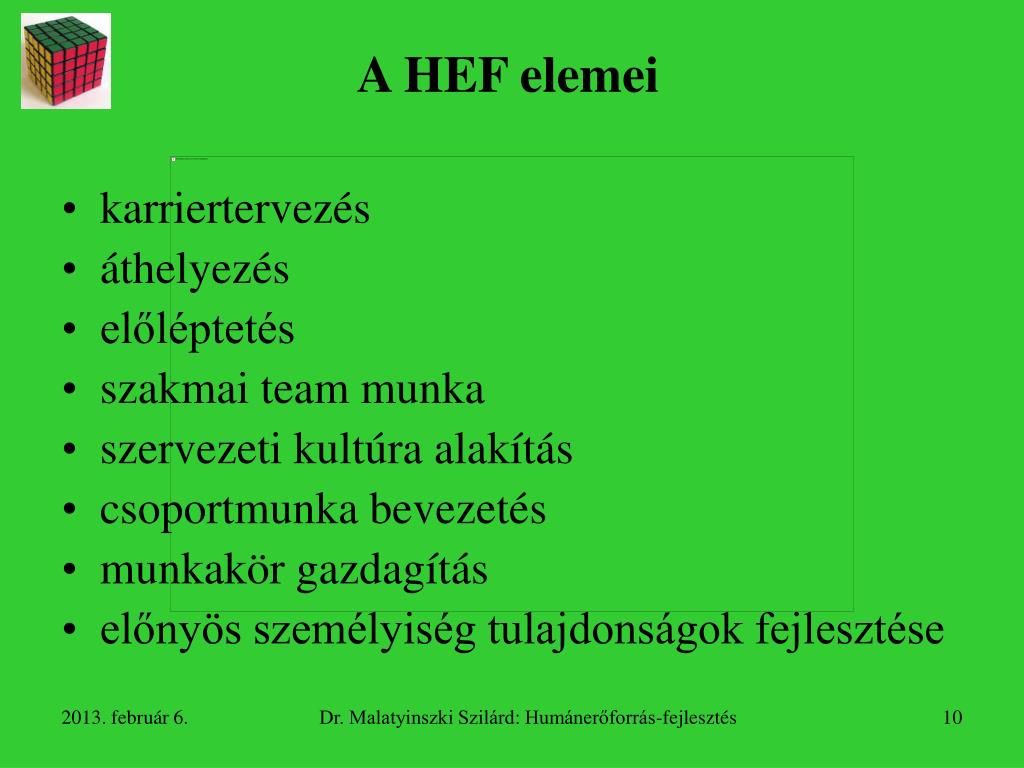 A HEF elemei • karriertervezés • áthelyezés • előléptetés • szakmai team munka • szervezeti kultúra alakítás • csoportmunka bevezetés • munkakör gazdagítás • előnyös személyiség tulajdonságok fejlesztése Dr. Malatyinszki Szilárd: Humánerőforrás-fejlesztés