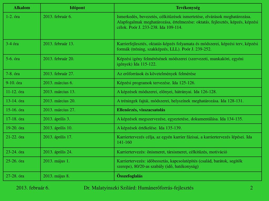 Humánerőforrás-fejlesztés 1-2. óra Ismerkedés, bevezetés, célkitűzések ismertetése, elvárások meghatározása. Alapfogalmak meghatározása, értelmezése: oktatás, fejlesztés, képzés, képzési célok. Dr. Malatyinszki Szilárd: Humánerőforrás-fejlesztés