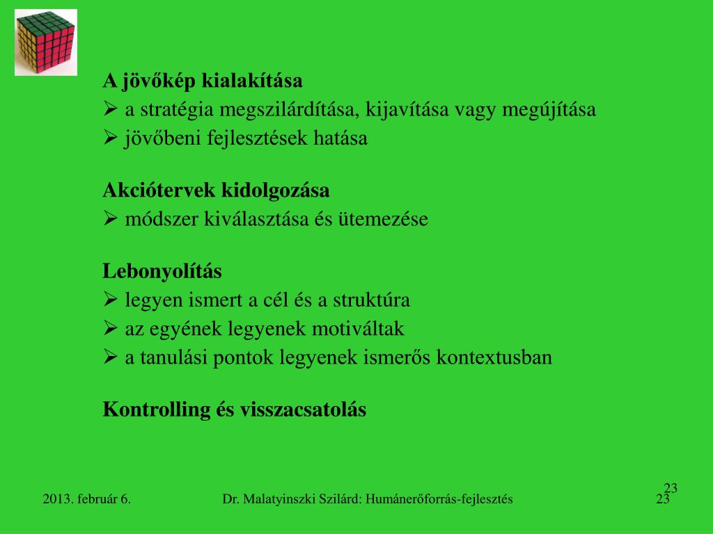 A jövőkép kialakítása a stratégia megszilárdítása, kijavítása vagy megújítása jövőbeni fejlesztések hatása Akciótervek kidolgozása módszer kiválasztása és ütemezése Lebonyolítás legyen ismert a cél és a struktúra az egyének legyenek motiváltak a tanulási pontok legyenek ismerős kontextusban Kontrolling és visszacsatolás 23 Dr. Malatyinszki Szilárd: Humánerőforrás-fejlesztés