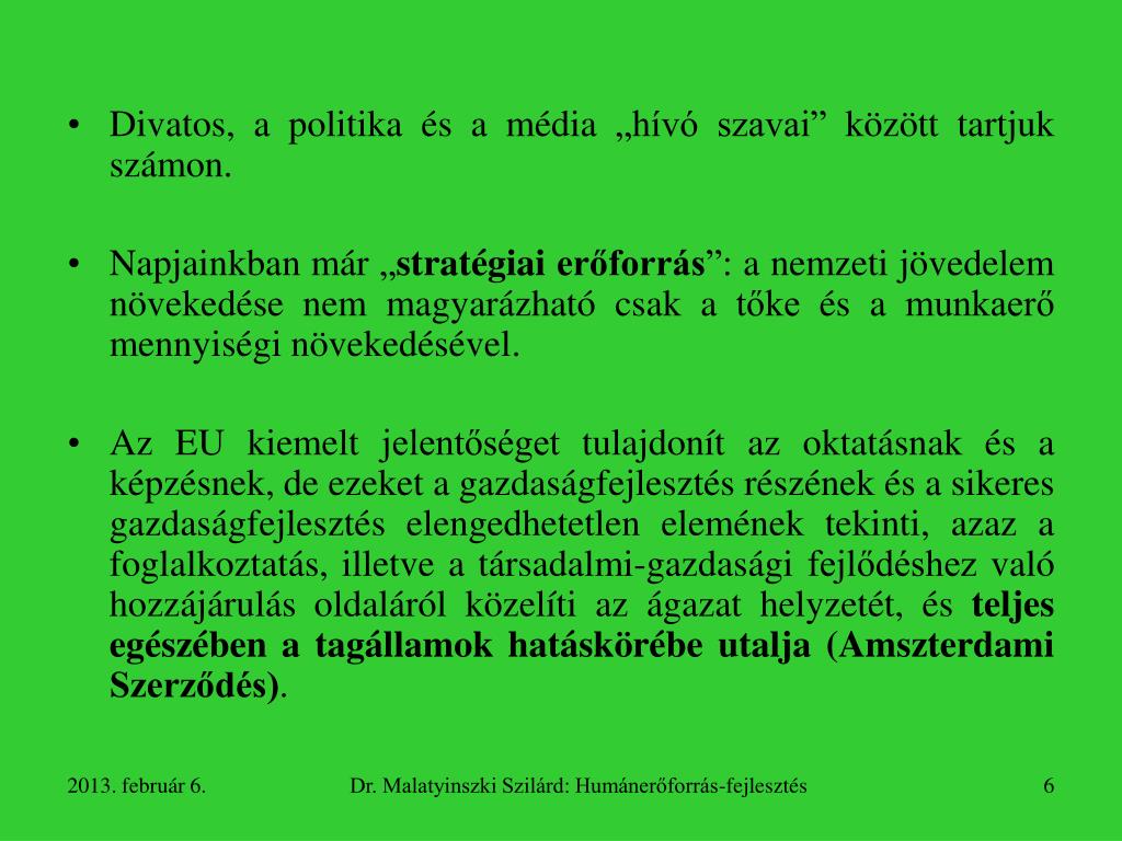 Divatos, a politika és a média „hívó szavai” között tartjuk számon. • Napjainkban már „stratégiai erőforrás”: a nemzeti jövedelem növekedése nem magyarázható csak a tőke és a munkaerő mennyiségi növekedésével. • Az EU kiemelt jelentőséget tulajdonít az oktatásnak és a képzésnek, de ezeket a gazdaságfejlesztés részének és a sikeres gazdaságfejlesztés elengedhetetlen elemének tekinti, azaz a foglalkoztatás, illetve a társadalmi-gazdasági fejlődéshez való hozzájárulás oldaláról közelíti az ágazat helyzetét, és teljes egészében a tagállamok hatáskörébe utalja (Amszterdami Szerződés). Dr. Malatyinszki Szilárd: Humánerőforrás-fejlesztés