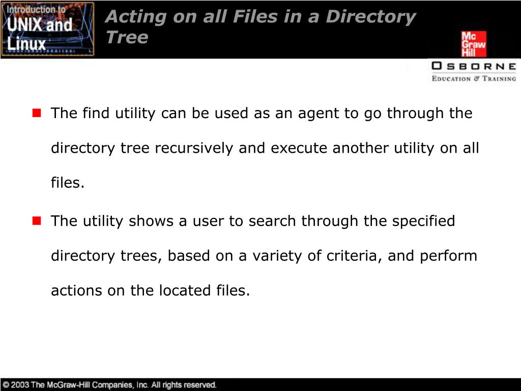 Acting on all Files in a Directory Tree • The find utility can be used as an agent to go through the directory tree recursively and execute another utility on all files. • The utility shows a user to search through the specified directory trees, based on a variety of criteria, and perform actions on the located files.