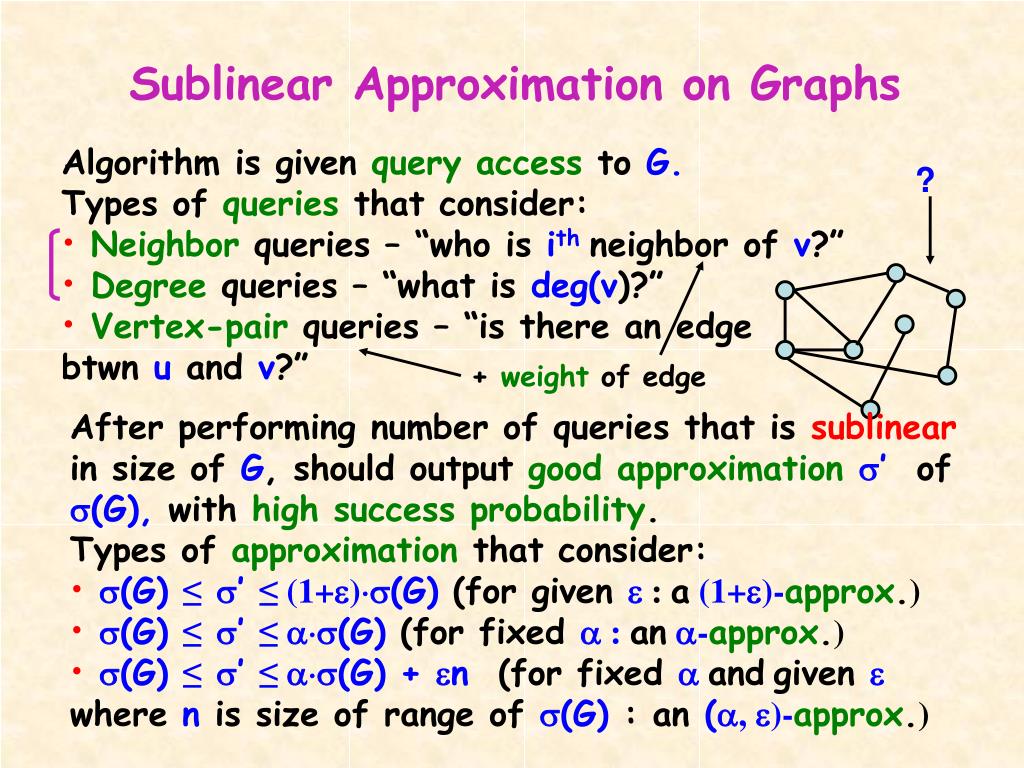 Sublinear Approximation on Graphs Algorithm is given query access to G. Types of queries that consider: • Neighbor queries – “who is ith neighbor of v?” • Degree queries – “what is deg(v)?” • Vertex-pair queries – “is there an edge btwn u and v?” ? + weight of edge After performing number of queries that is sublinear in size of G, should output good approximation’ of (G), with high success probability. Types of approximation that consider: • (G) ≤’≤ (1+)(G) (for given : a (1+)-approx.) • (G) ≤’≤ (G) (for fixed : an -approx.) • (G) ≤’≤ (G) + n (for fixed andgiven where n is size of range of(G) : an (, )-approx.)
