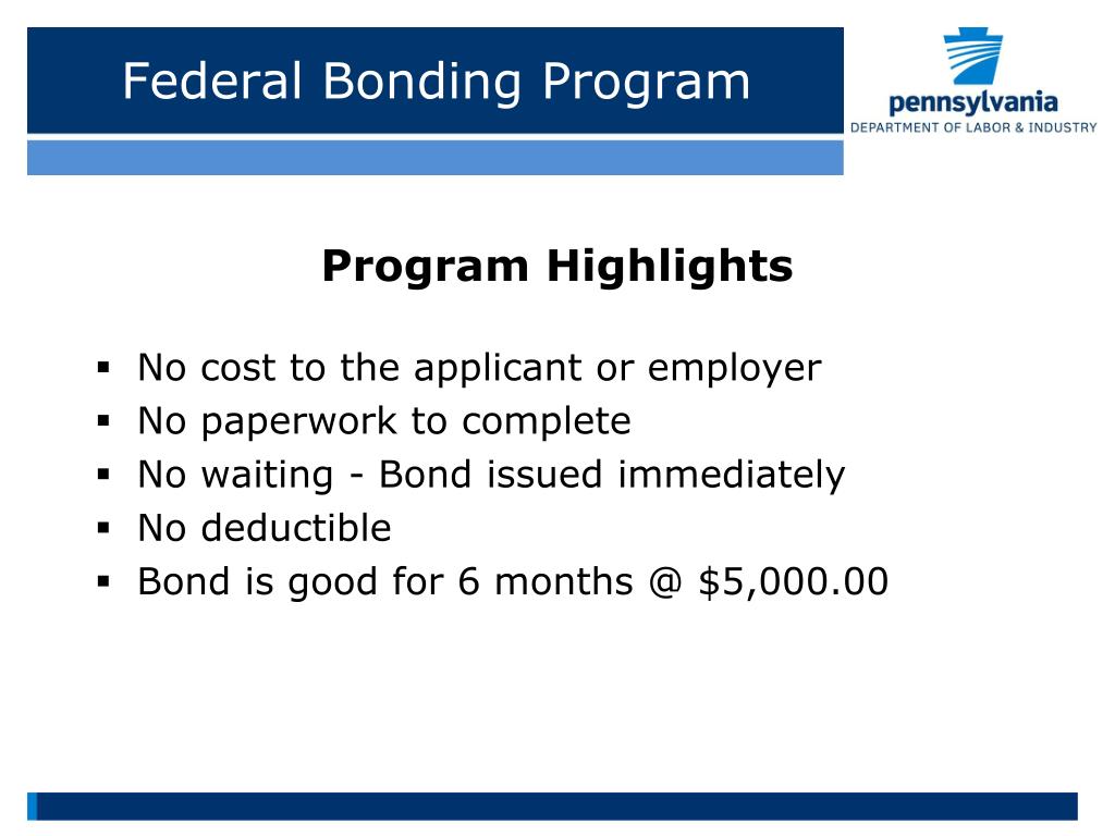 Federal Bonding Program Program Highlights • No cost to the applicant or employer • No paperwork to complete • No waiting - Bond issued immediately • No deductible • Bond is good for 6 months @ $5,000.00