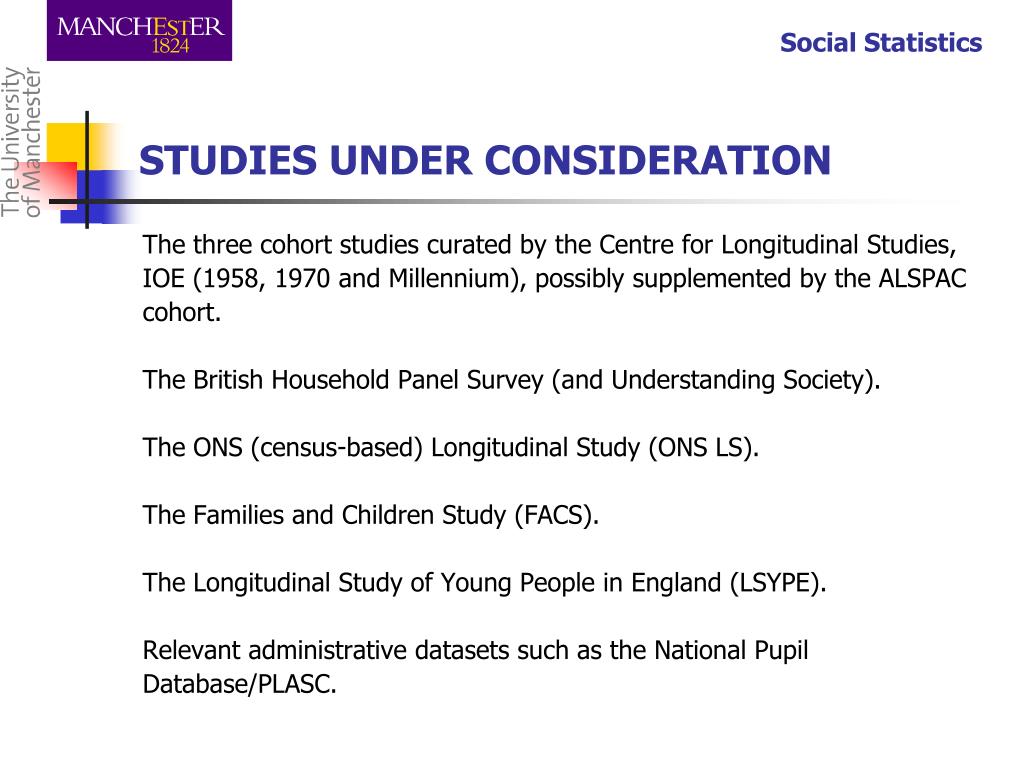 STUDIES UNDER CONSIDERATION The three cohort studies curated by the Centre for Longitudinal Studies, IOE (1958, 1970 and Millennium), possibly supplemented by the ALSPAC cohort. The British Household Panel Survey (and Understanding Society). The ONS (census-based) Longitudinal Study (ONS LS). The Families and Children Study (FACS). The Longitudinal Study of Young People in England (LSYPE). Relevant administrative datasets such as the National Pupil Database/PLASC.
