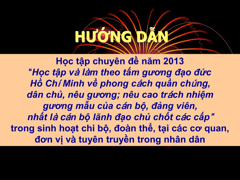 HƯỚNG DẪN Học tập chuyên đề năm 2013 “Học tập và làm theo tấm gương đạo đức Hồ Chí Minh về phong cách quần chúng, dân chủ, nêu gương; nêu cao trách nhiệm gương mẫu của cán bộ, đảng viên, nhất là cán bộ lãnh đạo chủ chốt các cấp”trong sinh hoạt chi bộ, đoàn thể, tại các cơ quan, đơn vị và tuyên truyền trong nhân dân