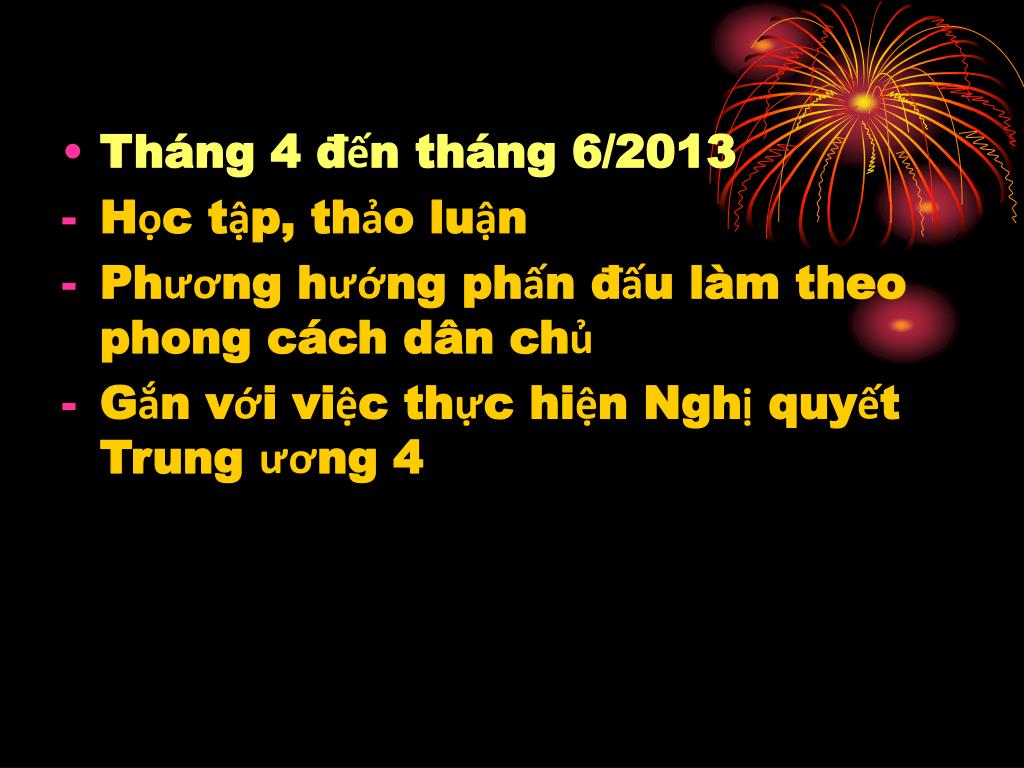 Tháng 4 đến tháng 6/2013 • Học tập, thảo luận • Phương hướng phấn đấu làm theo phong cách dân chủ • Gắn với việc thực hiện Nghị quyết Trung ương 4