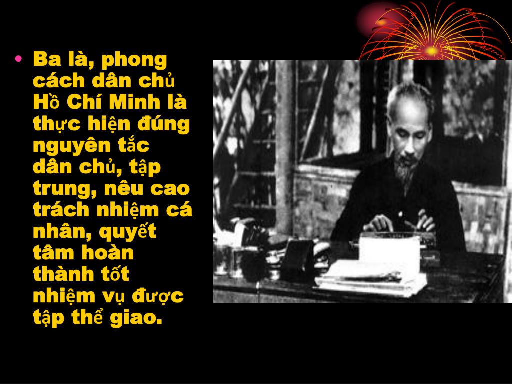 Ba là, phong cách dân chủ Hồ Chí Minh là thực hiện đúng nguyên tắc dân chủ, tập trung, nêu cao trách nhiệm cá nhân, quyết tâm hoàn thành tốt nhiệm vụ được tập thể giao.
