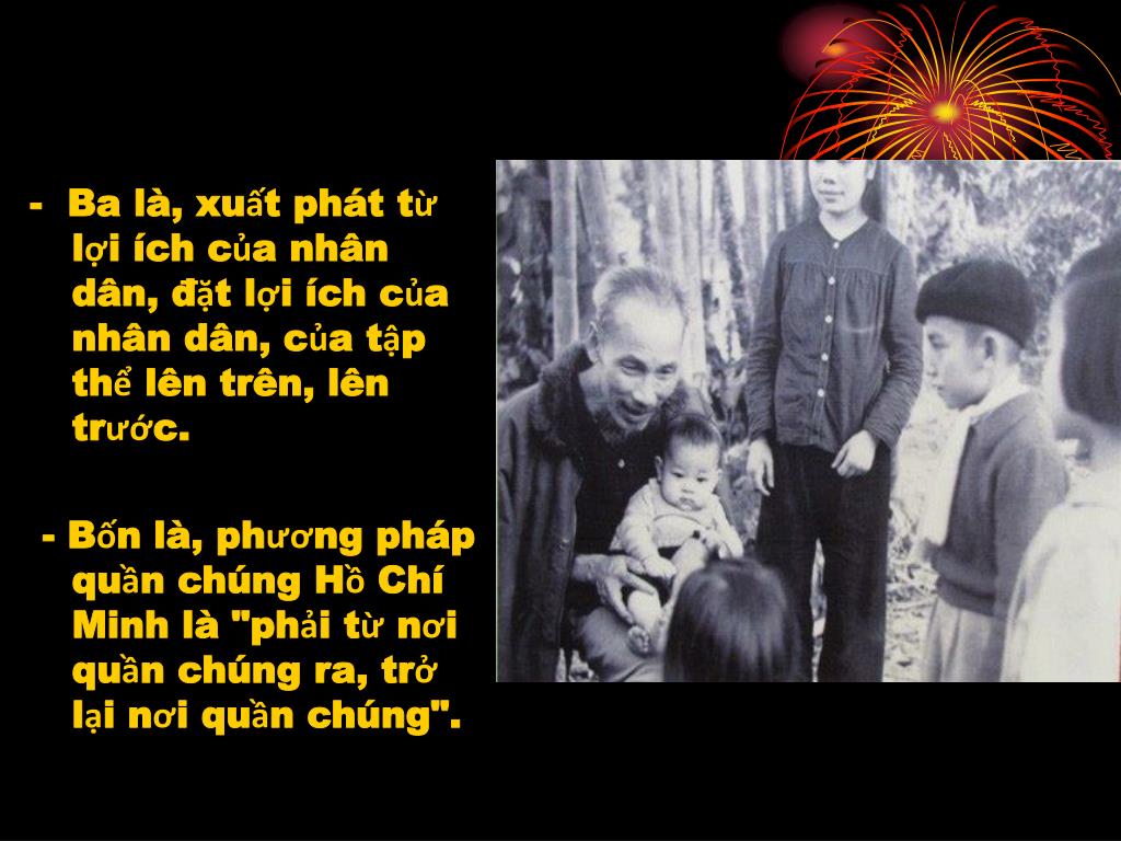 - Ba là, xuất phát từ lợi ích của nhân dân, đặt lợi ích của nhân dân, của tập thể lên trên, lên trước. - Bốn là, phương pháp quần chúng Hồ Chí Minh là "phải từ nơi quần chúng ra, trở lại nơi quần chúng".