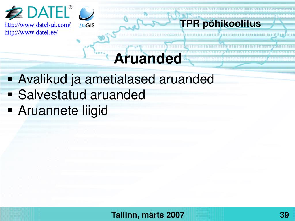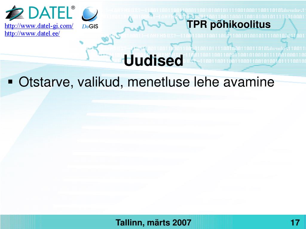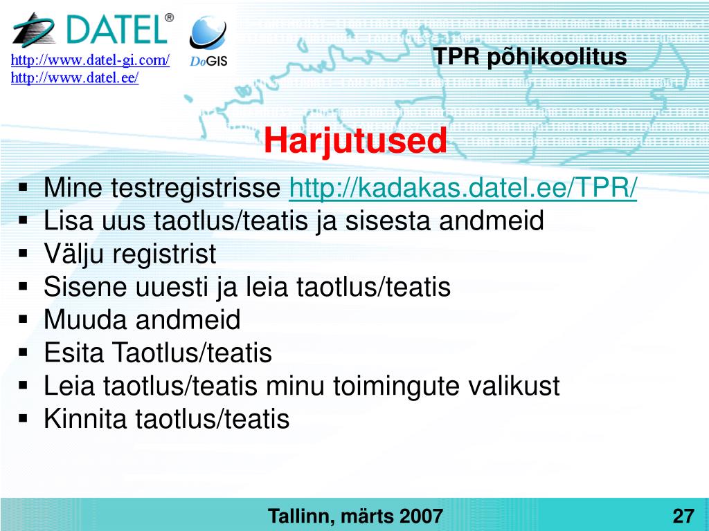TPR põhikoolitus Harjutused • Mine testregistrisse http://kadakas.datel.ee/TPR/ • Lisa uus taotlus/teatis ja sisesta andmeid • Välju registrist • Sisene uuesti ja leia taotlus/teatis • Muuda andmeid • Esita Taotlus/teatis • Leia taotlus/teatis minu toimingute valikust • Kinnita taotlus/teatis