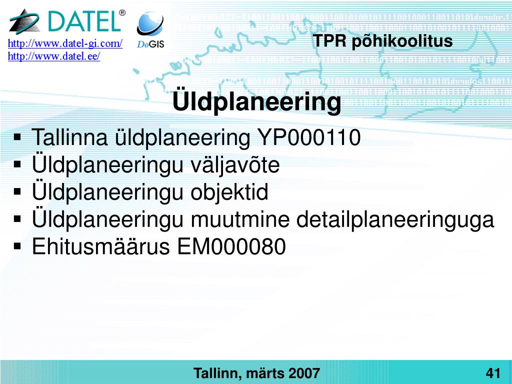 TPR põhikoolitus Üldplaneering • Tallinna üldplaneering YP000110 • Üldplaneeringu väljavõte • Üldplaneeringu objektid • Üldplaneeringu muutmine detailplaneeringuga • Ehitusmäärus EM000080