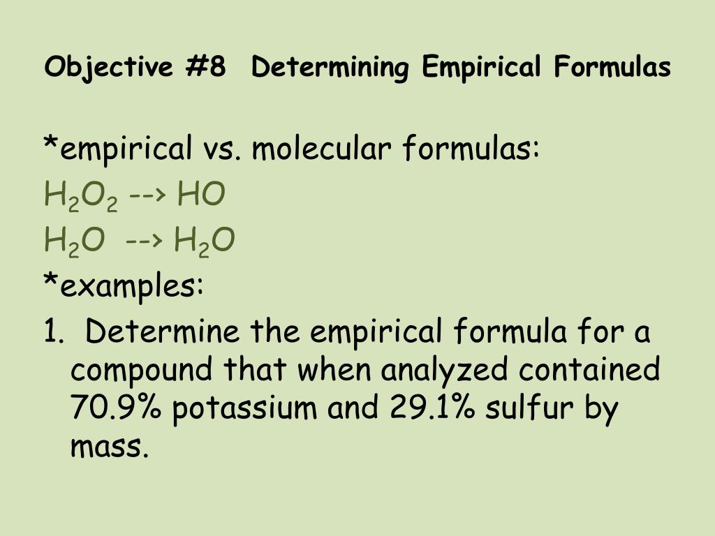 Objective #8 Determining Empirical Formulas *empirical vs. molecular formulas: H2O2 --› HO H2O --› H2O *examples: 1. Determine the empirical formula for a compound that when analyzed contained 70.9% potassium and 29.1% sulfur by mass.