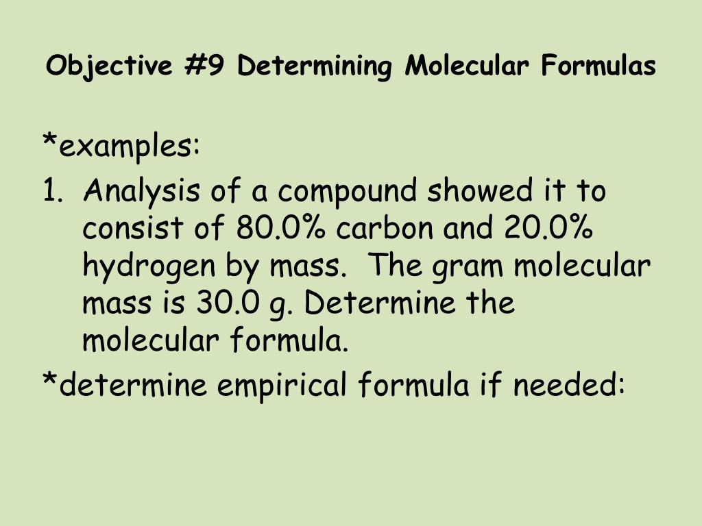 Objective #9 Determining Molecular Formulas *examples: • Analysis of a compound showed it to consist of 80.0% carbon and 20.0% hydrogen by mass. The gram molecular mass is 30.0 g. Determine the molecular formula. *determine empirical formula if needed: