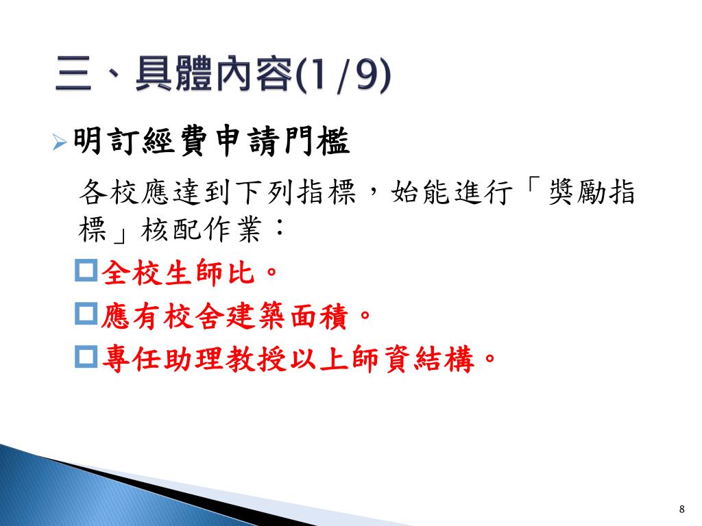 三、具體內容(1/9) • 明訂經費申請門檻 各校應達到下列指標,始能進行「獎勵指標」核配作業: • 全校生師比。 • 應有校舍建築面積。 • 專任助理教授以上師資結構。