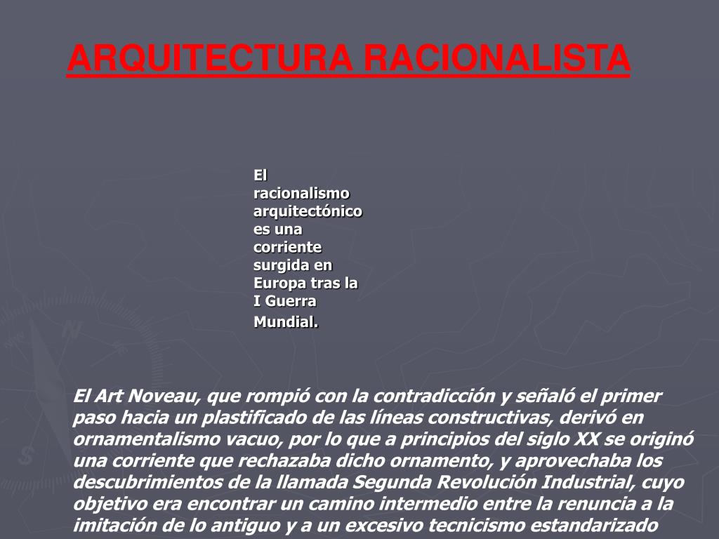 ARQUITECTURA RACIONALISTA El racionalismo arquitectónico es una corriente surgida en Europa tras la I Guerra Mundial. El Art Noveau, que rompió con la contradicción y señaló el primer paso hacia un plastificado de las líneas constructivas, derivó en ornamentalismo vacuo, por lo que a principios del siglo XX se originó una corriente que rechazaba dicho ornamento, y aprovechaba los descubrimientos de la llamada Segunda Revolución Industrial, cuyo objetivo era encontrar un camino intermedio entre la renuncia a la imitación de lo antiguo y a un excesivo tecnicismo estandarizado