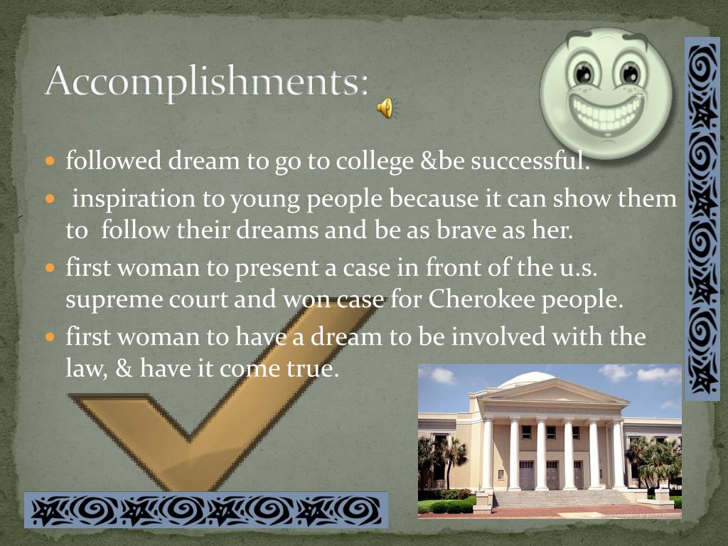 Accomplishments: • followed dream to go to college &be successful. • inspiration to young people because it can show them to follow their dreams and be as brave as her. • first woman to present a case in front of the u.s. supreme court and won case for Cherokee people. • first woman to have a dream to be involved with the law, & have it cometrue.