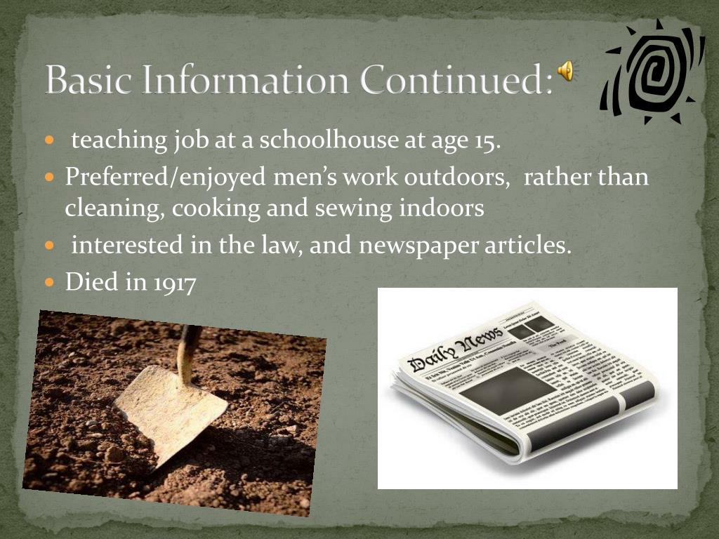 Basic Information Continued: • teaching job at a schoolhouse at age 15. • Preferred/enjoyed men’s work outdoors, rather than cleaning, cooking and sewing indoors • interested in the law, and newspaper articles. • Died in 1917