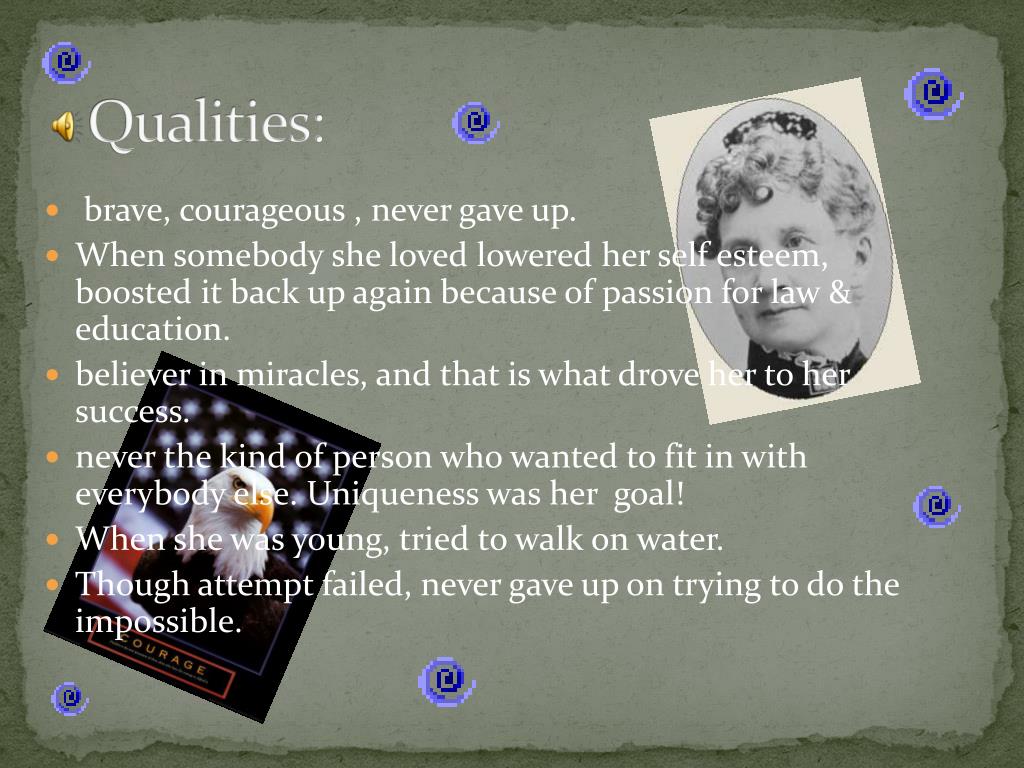 Qualities: • brave, courageous ,never gave up. • When somebody she loved lowered her self esteem, boosted it back up again because of passion for law & education. • believer in miracles, and that is what drove her to her success. • never the kind of person who wanted to fit in with everybody else. Uniqueness was her goal! • When she was young, tried to walk on water. • Though attempt failed, never gave up on trying to do the impossible.
