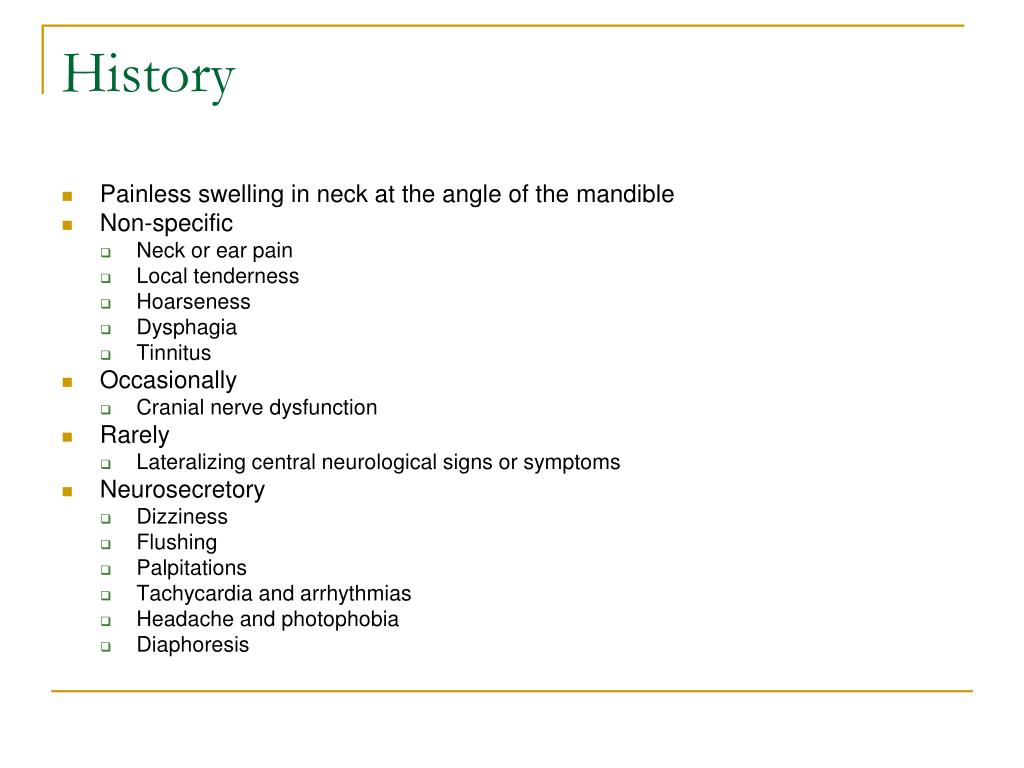History • Painless swelling in neck at the angle of the mandible • Non-specific • Neck or ear pain • Local tenderness • Hoarseness • Dysphagia • Tinnitus • Occasionally • Cranial nerve dysfunction • Rarely • Lateralizing central neurological signs or symptoms • Neurosecretory • Dizziness • Flushing • Palpitations • Tachycardia and arrhythmias • Headache and photophobia • Diaphoresis
