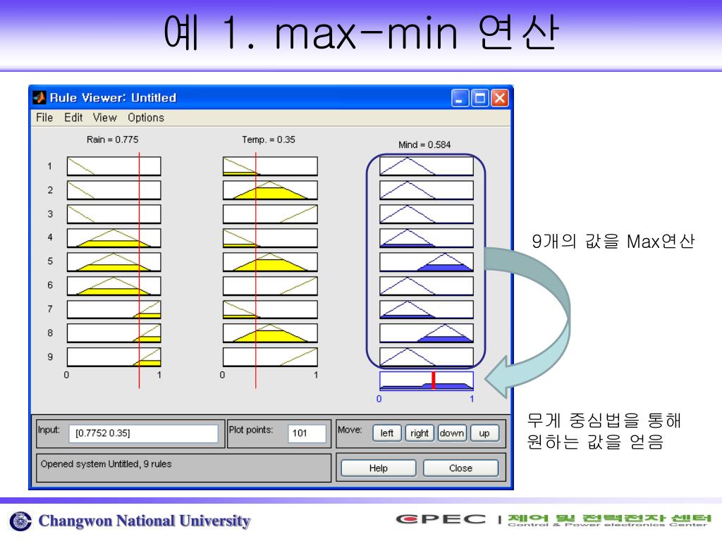 예 1. max-min 연산 9개의 룰들에 값을 max-min 연산을 통해 출력부 (후건부)의 퍼지 값을 얻어 낸다. 비퍼지화 단계(무게 중심 법)를 통해 원하는 상수 값 출력