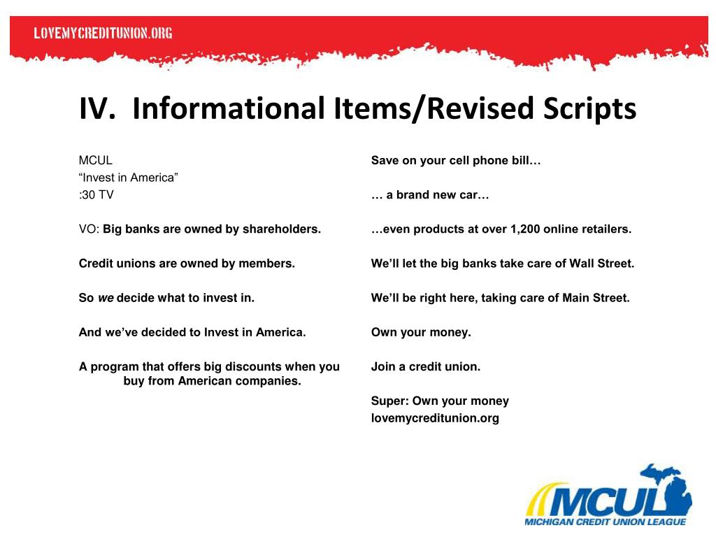 IV. Informational Items/Revised Scripts MCUL “Invest in America” :30 TV VO: Big banks are owned by shareholders. Credit unions are owned by members. So we decide what to invest in. And we’ve decided to Invest in America. A program that offers big discounts when you buy from American companies. Save on your cell phone bill… … a brand new car… …even products at over 1,200 online retailers. We’ll let the big banks take care of Wall Street. We’ll be right here, taking care of Main Street. Own your money. Join a credit union. Super: Own your money lovemycreditunion.org