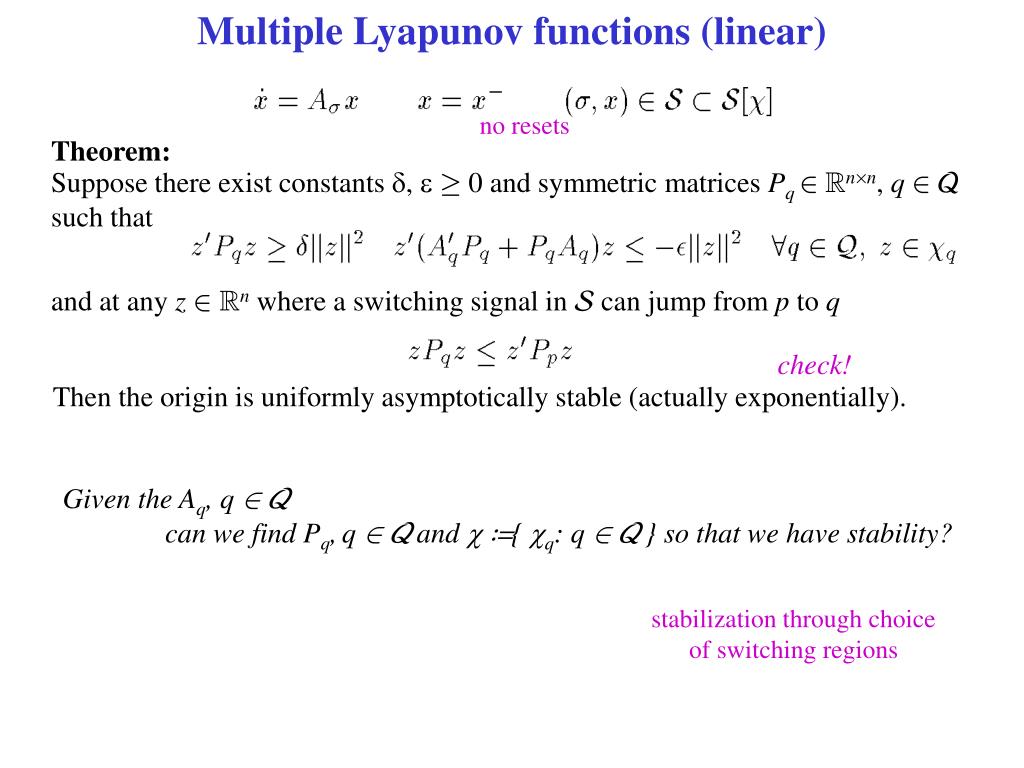 Multiple Lyapunov functions (linear) no resets Theorem: Suppose there exist constants d, e ¸ 0 and symmetric matrices Pq 2Rn£n, q 2 Q such that and at any z 2 Rn where a switching signal in S can jump from p to q check! Then the origin is uniformly asymptotically stable (actually exponentially). Given the Aq, q 2 Q can we find Pq,q 2 Q and c { cq: q 2 Q } so that we have stability? stabilization through choice of switching regions