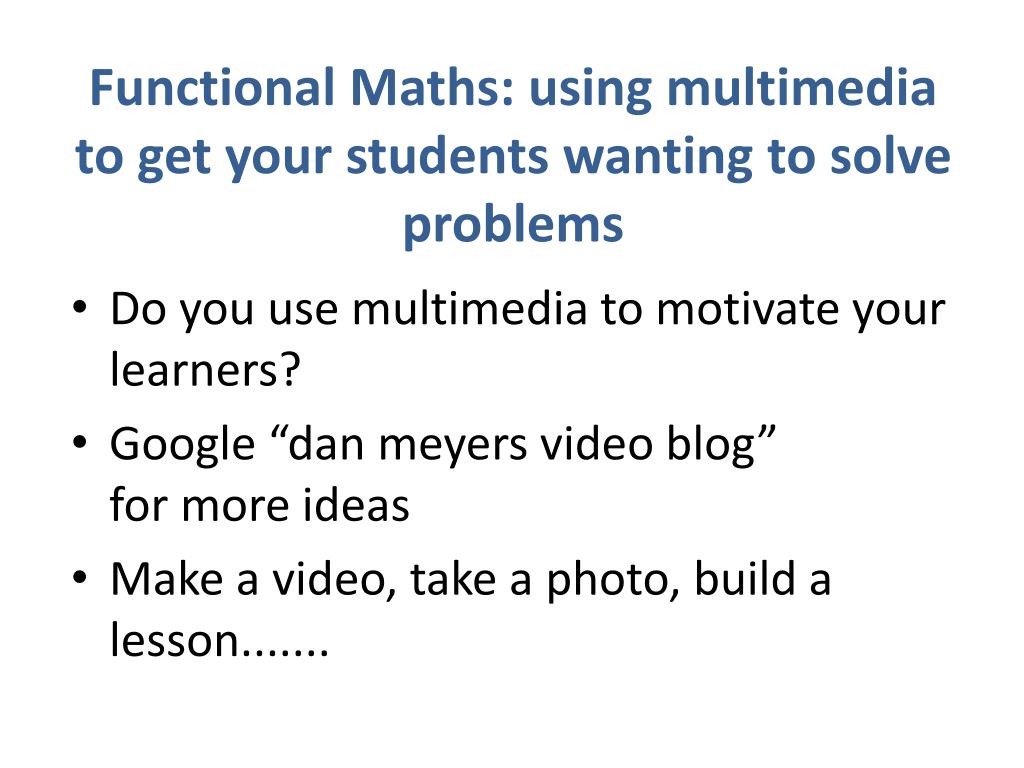 Functional Maths: using multimedia to get your students wanting to solve problems • Do you use multimedia to motivate your learners? • Google “danmeyers video blog”for more ideas • Make a video, take a photo, build a lesson.......