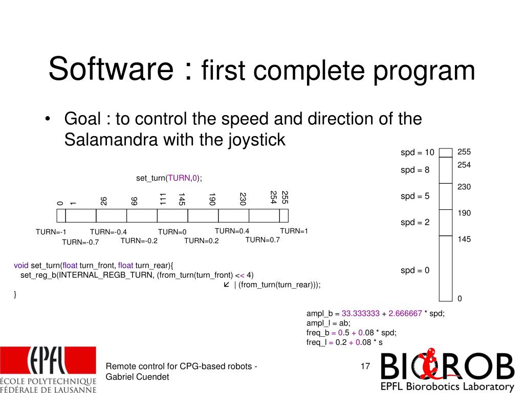 Software : first complete program • Goal : to control the speed and direction of the Salamandra with the joystick spd = 10 255 254 spd = 8 set_turn(TURN,0); 230 spd = 5 254 255 111 145 190 230 26 66 0 1 190 spd = 2 TURN=0.4 TURN=1 TURN=-1 TURN=-0.4 TURN=0 145 TURN=0.7 TURN=-0.2 TURN=0.2 TURN=-0.7 void set_turn(float turn_front, float turn_rear){ set_reg_b(INTERNAL_REGB_TURN, (from_turn(turn_front) << 4) | (from_turn(turn_rear))); } spd = 0 0 ampl_b = 33.333333 + 2.666667 * spd; ampl_l = ab; freq_b = 0.5 + 0.08 * spd; freq_l = 0.2 + 0.08 * s Remote control for CPG-based robots - Gabriel Cuendet
