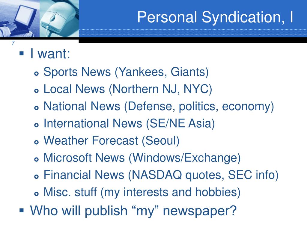 Personal Syndication, I • I want: • Sports News (Yankees, Giants) • Local News (Northern NJ, NYC) • National News (Defense, politics, economy) • International News (SE/NE Asia) • Weather Forecast (Seoul) • Microsoft News (Windows/Exchange) • Financial News (NASDAQ quotes, SEC info) • Misc. stuff (my interests and hobbies) • Who will publish “my” newspaper?
