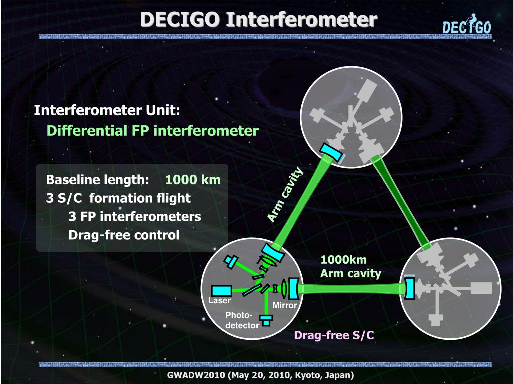 DECIGO Interferometer Interferometer Unit: Differential FP interferometer Baselinelength: 1000 km 3 S/C formation flight 3 FP interferometers Drag-free control Arm cavity 1000km Arm cavity Laser Mirror Photo- detector Drag-free S/C GWADW2010 (May 20, 2010, Kyoto, Japan)