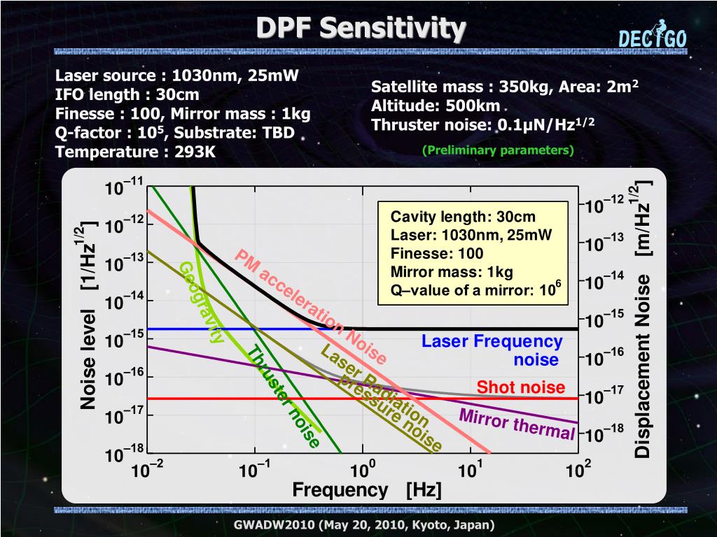 DPF Sensitivity Laser source : 1030nm, 25mW IFO length : 30cm Finesse : 100, Mirror mass : 1kg Q-factor : 105, Substrate: TBD Temperature : 293K Satellite mass : 350kg, Area: 2m2 Altitude: 500km Thruster noise: 0.1μN/Hz1/2 (Preliminary parameters) GWADW2010 (May 20, 2010, Kyoto, Japan)