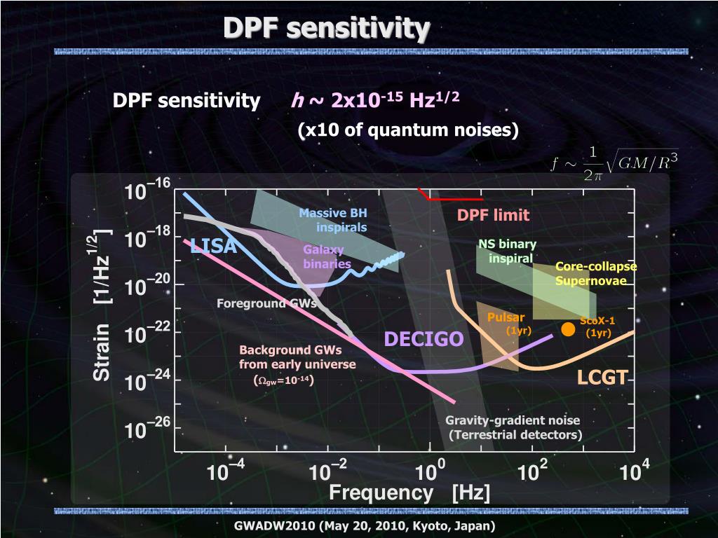 GW target of DPF Blackholesevents in our galaxy IMBH inspiral and merger h~ 10-15 , f ~ 4 Hz Distance 10kpc, m = 103 Msun Obs. Duration(~1000sec) BH QNM h ~ 10-15 , f ~ 0.3 Hz Distance 1Mpc, m = 105 Msun Observable range covers our Galaxy(SNR~5 ) Hard to access by others Original observation KAGAYA (By K.Yagi) GWADW2010 (May 20, 2010, Kyoto, Japan)