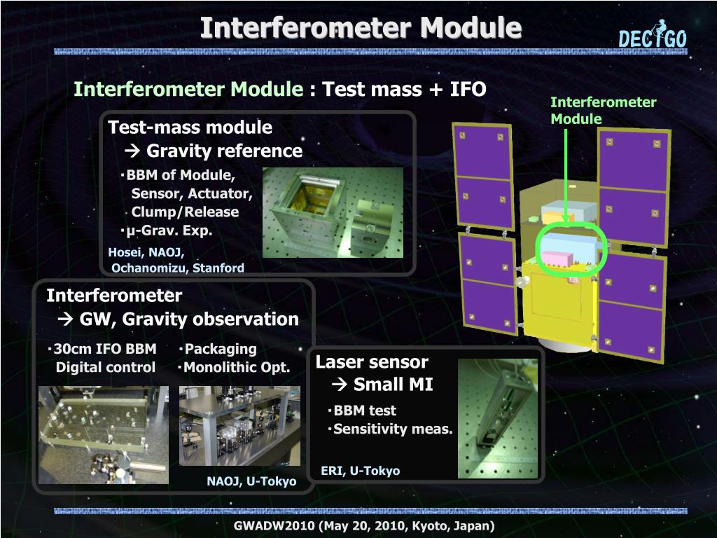 Interferometer Module Interferometer Module: Test mass+ IFO Interferometer Module Test-mass module Gravity reference ・BBM of Module, Sensor, Actuator, Clump/Release ・μ-Grav. Exp. Hosei, NAOJ, Ochanomizu, Stanford Interferometer GW, Gravity observation ・30cm IFO BBM ・Packaging Digitalcontrol ・Monolithic Opt. Laser sensor Small MI ・BBM test ・Sensitivity meas. ERI, U-Tokyo NAOJ, U-Tokyo GWADW2010 (May 20, 2010, Kyoto, Japan)