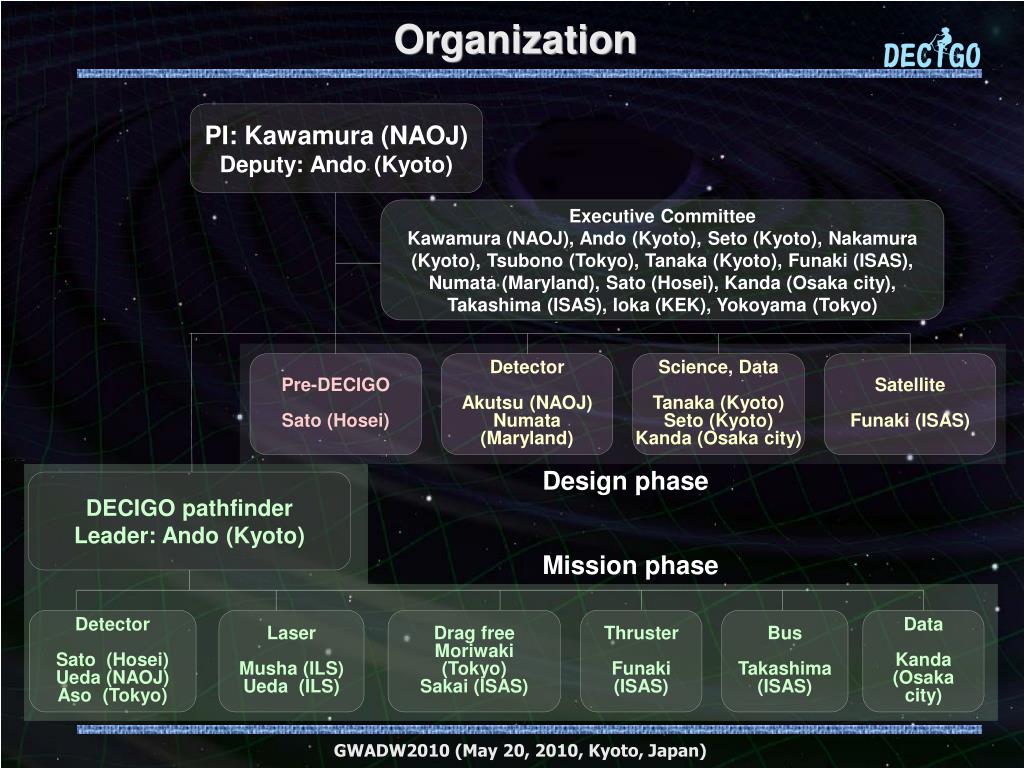 Organization PI: Kawamura (NAOJ) Deputy: Ando (Kyoto) Executive Committee Kawamura (NAOJ), Ando (Kyoto), Seto (Kyoto), Nakamura (Kyoto), Tsubono (Tokyo), Tanaka (Kyoto), Funaki (ISAS), Numata (Maryland), Sato (Hosei), Kanda (Osaka city), Takashima (ISAS), Ioka (KEK), Yokoyama (Tokyo) Pre-DECIGO Sato (Hosei) Detector Akutsu (NAOJ) Numata (Maryland) Science, Data Tanaka (Kyoto) Seto (Kyoto) Kanda (Osaka city) Satellite Funaki (ISAS) Design phase DECIGO pathfinder Leader: Ando (Kyoto) Mission phase Detector Sato (Hosei) Ueda (NAOJ) Aso (Tokyo) Laser Musha (ILS) Ueda (ILS) Drag free Moriwaki (Tokyo) Sakai (ISAS) Thruster Funaki (ISAS) Bus Takashima (ISAS) Data Kanda (Osaka city) GWADW2010 (May 20, 2010, Kyoto, Japan)