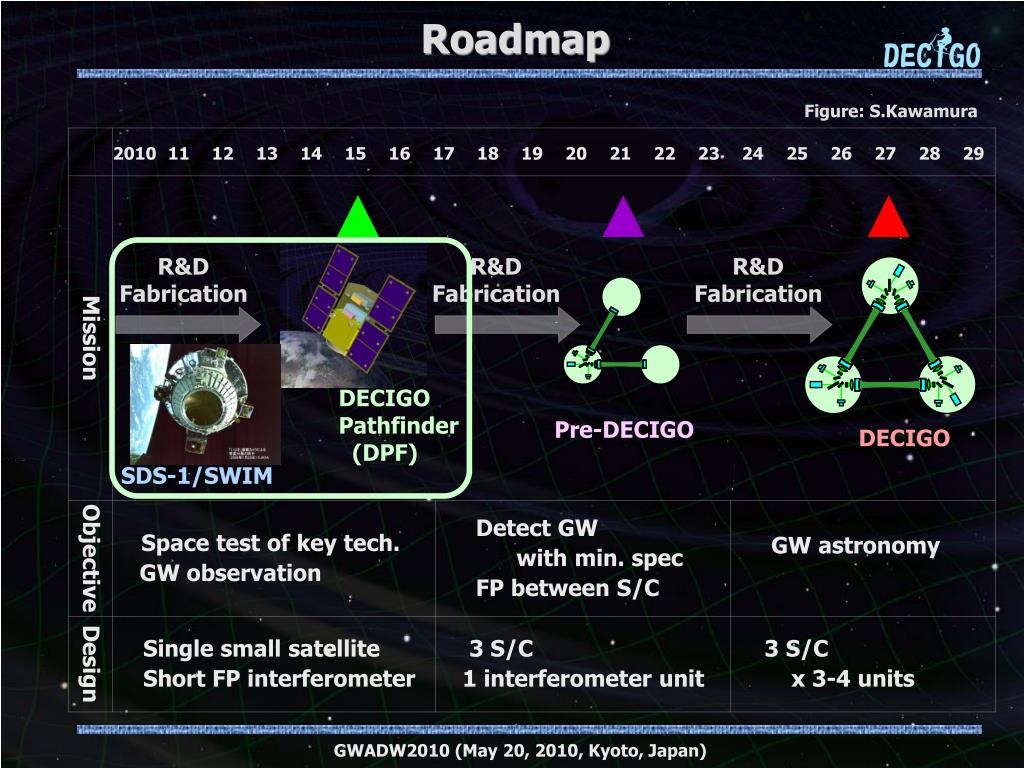 Roadmap Figure: S.Kawamura R&D Fabrication R&D Fabrication R&D Fabrication DECIGO Pathfinder (DPF) Pre-DECIGO DECIGO SDS-1/SWIM GWADW2010 (May 20, 2010, Kyoto, Japan)