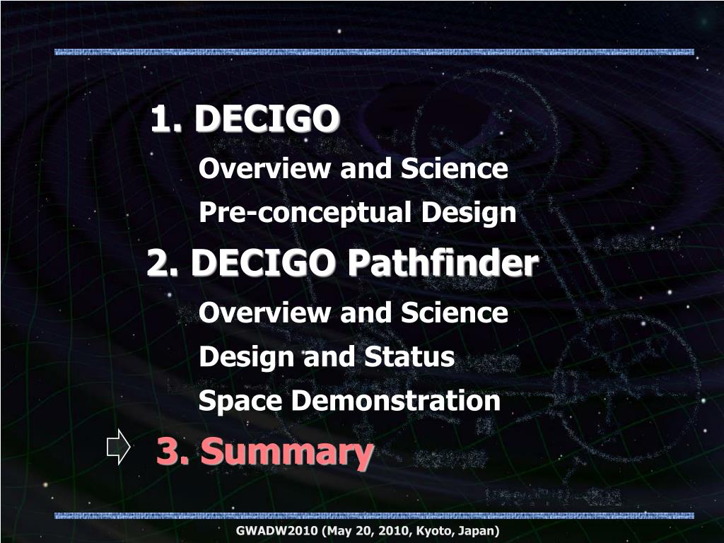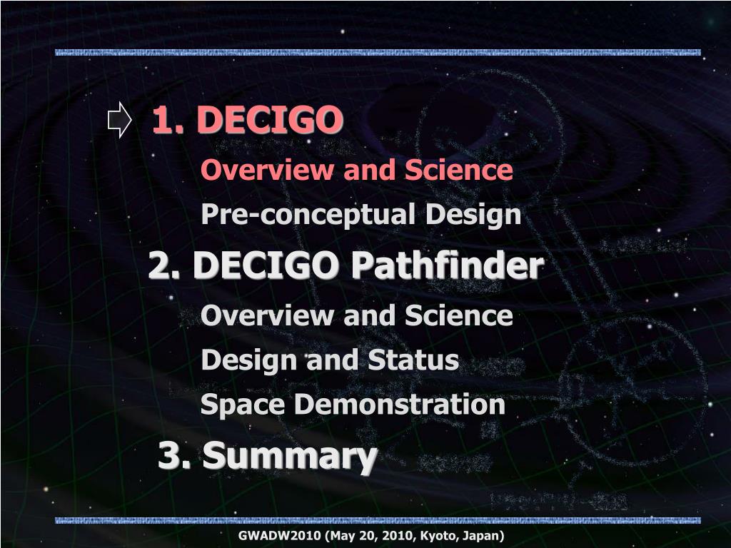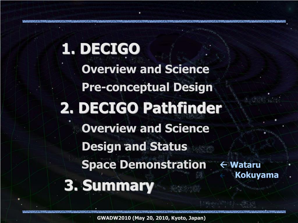 1. DECIGO Overview and Science Pre-conceptual Design 2. DECIGO Pathfinder Overview and Science Design and Status Space Demonstration 3. Summary Wataru • Kokuyama GWADW2010 (May 20, 2010, Kyoto, Japan)