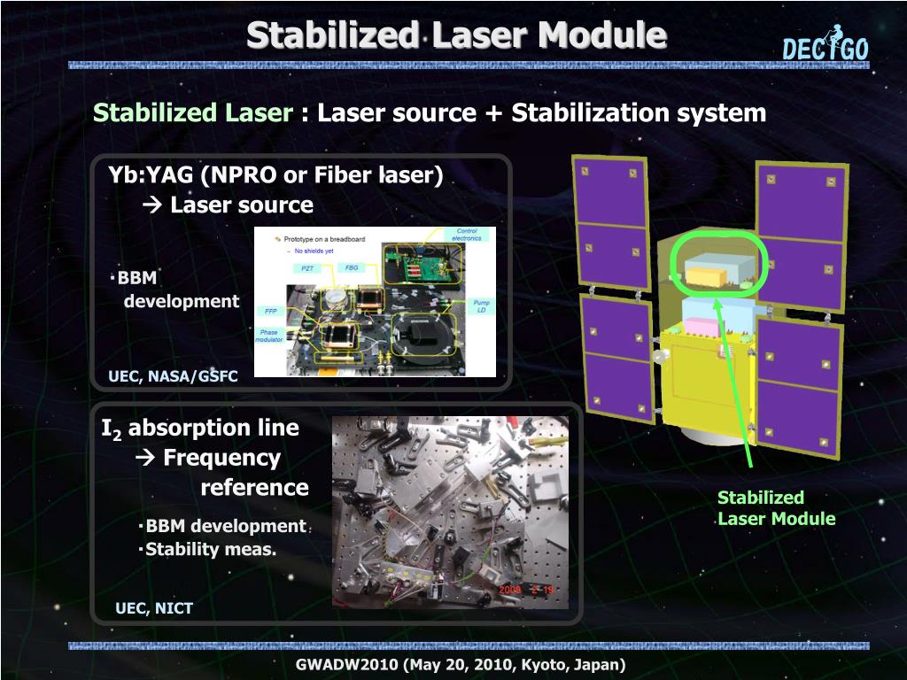 Stabilized Laser Module Stabilized Laser: Laser source+ Stabilization system Yb:YAG (NPRO or Fiber laser) Laser source ・BBM development UEC, NASA/GSFC I2 absorption line Frequency reference Stabilized Laser Module ・BBMdevelopment ・Stability meas. UEC, NICT GWADW2010 (May 20, 2010, Kyoto, Japan)
