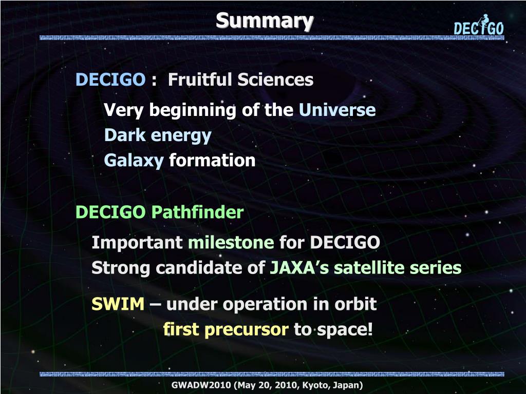 Summary DECIGO : Fruitful Sciences Very beginning of the Universe Dark energy Galaxy formation DECIGO Pathfinder Importantmilestone for DECIGO Strong candidate of JAXA’s satellite series SWIM – under operation in orbit first precursor to space! GWADW2010 (May 20, 2010, Kyoto, Japan)