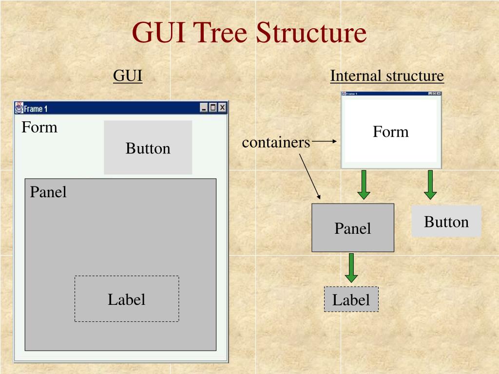 GUI Tree Structure GUI Internal structure Form Form Button containers Panel Panel Button Label Label