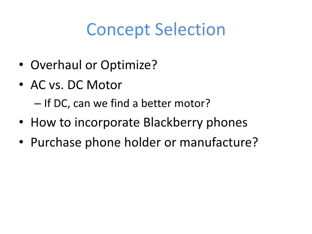 Concept Selection • Overhaul or Optimize? • AC vs. DC Motor • If DC, can we find a better motor? • How to incorporate Blackberry phones • Purchase phone holder or manufacture?