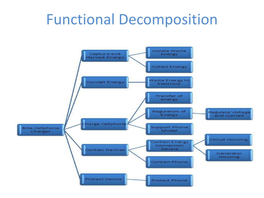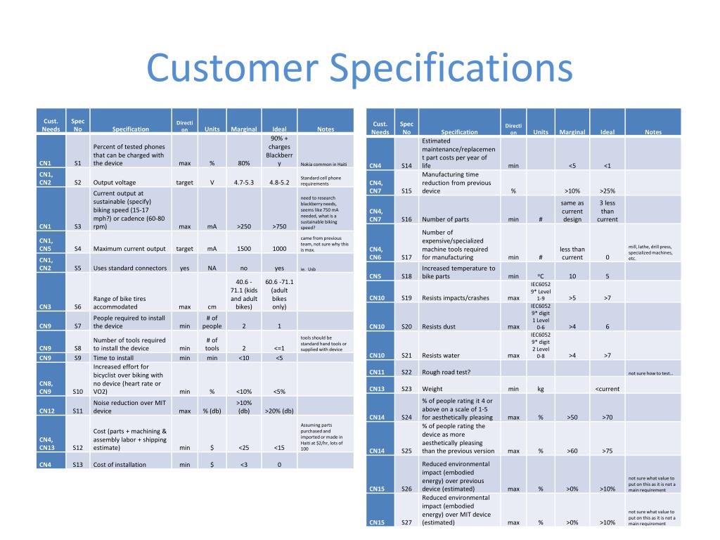Customer Needs • Must be able to charge Nokia cell phones (250mA, 3.5V) • Ability to charge Blackberries (750mA, 5V) desirable but not strictly necessary • Design should be adaptable and fit a variety of bicycle frames • Easy installation (little to no tool use) • User feedback is important, user wants to see the phone charging • Total material costs should be <$15 with <1hr labor • MIT design is $11 but lacks phone housing • Willing to ship materials and more complicated components (breadboard, generator, etc) but main assembly should be done on-sight with minimal supervision • Should not use any machining equipment more complicated/expensive than hand tools • Forgiving tolerances • Design should be simple enough to repair and/or cheap enough to replace if broken