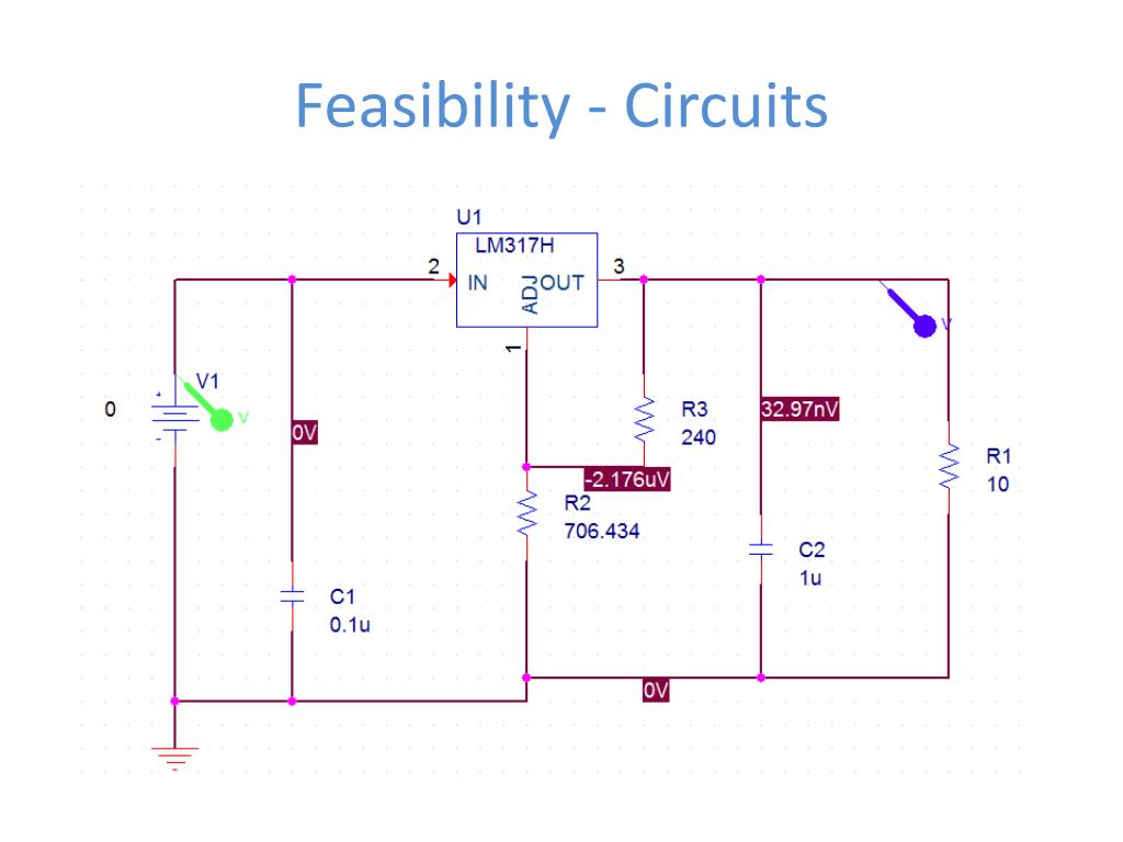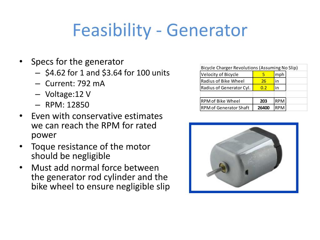 Feasibility - Generator • Specs for the generator • $4.62 for 1 and $3.64 for 100 units • Current: 792 mA • Voltage:12 V • RPM: 12850 • Even with conservative estimates we can reach the RPM for rated power • Toque resistance of the motor should be negligible • Must add normal force between the generator rod cylinder and the bike wheel to ensure negligible slip