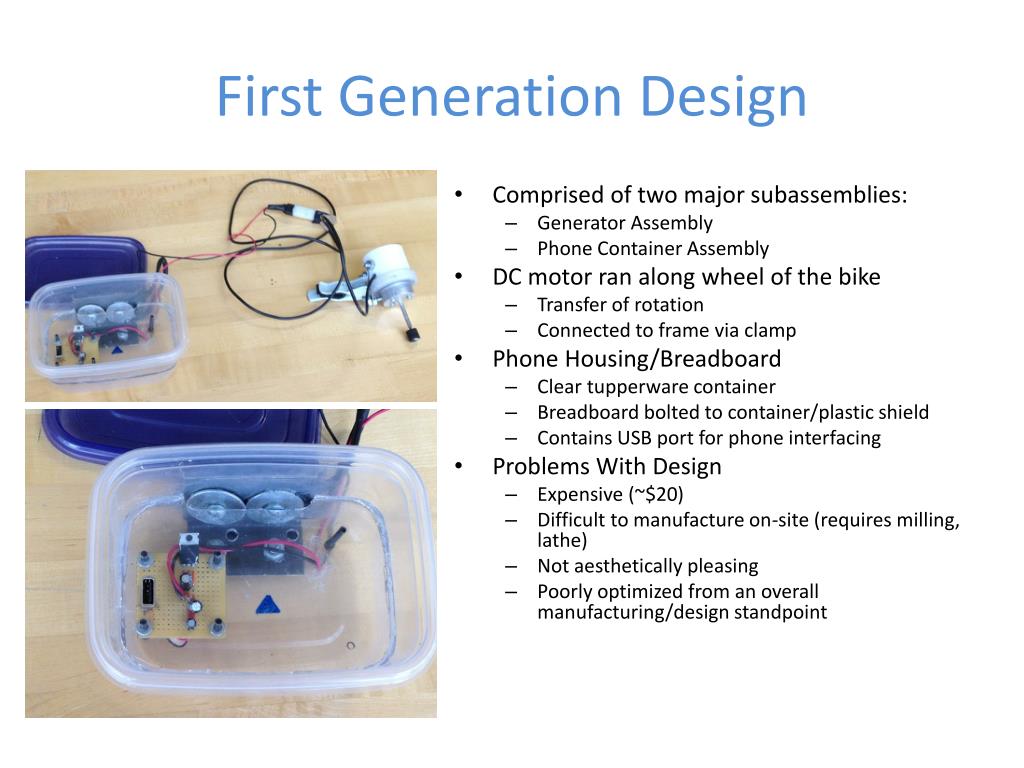 First Generation Design • Comprised of two major subassemblies: • Generator Assembly • Phone Container Assembly • DC motor ran along wheel of the bike • Transfer of rotation • Connected to frame via clamp • Phone Housing/Breadboard • Clear tupperware container • Breadboard bolted to container/plastic shield • Contains USB port for phone interfacing • Problems With Design • Expensive (~$20) • Difficult to manufacture on-site (requires milling, lathe) • Not aesthetically pleasing • Poorly optimized from an overall manufacturing/design standpoint