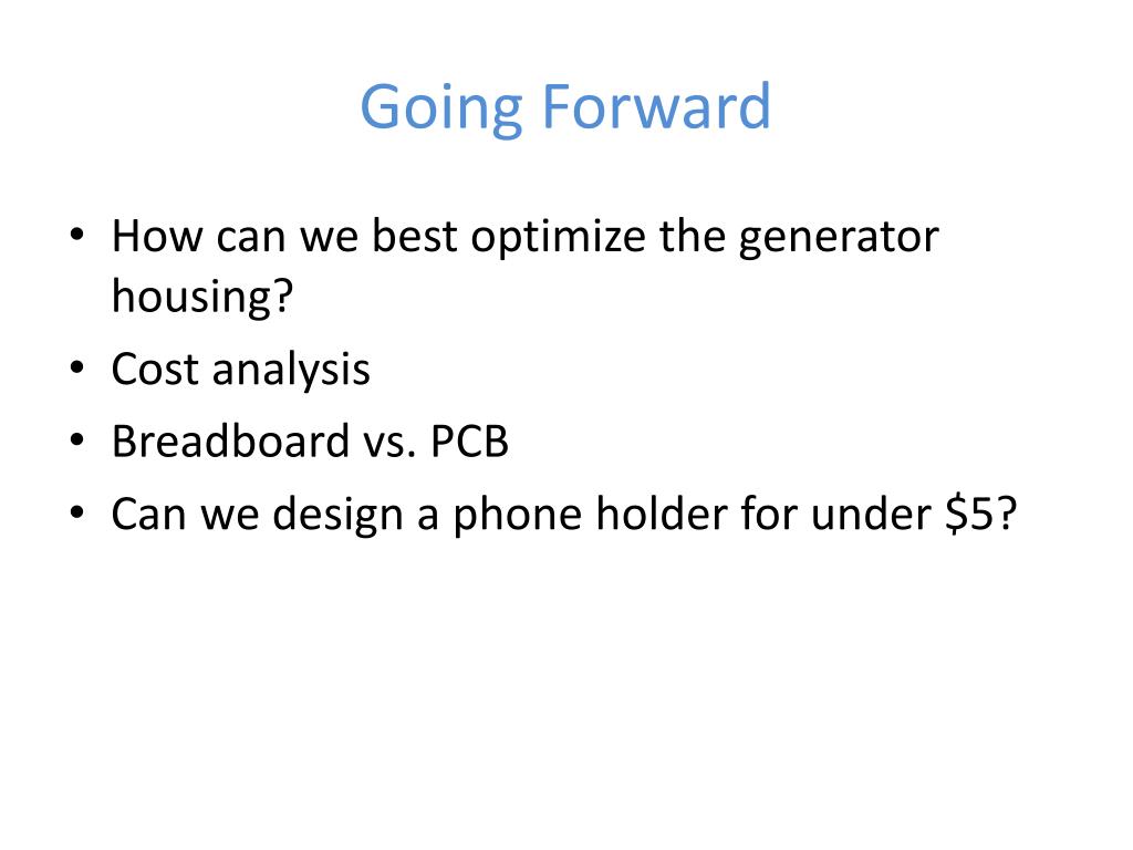Going Forward • How can we best optimize the generator housing? • Cost analysis • Breadboard vs. PCB • Can we design a phone holder for under $5?