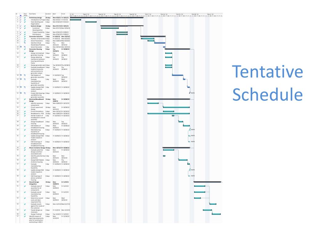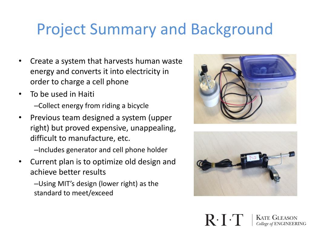 Project Summary and Background • Create a system that harvests human waste energy and converts it into electricity in order to charge a cell phone • To be used in Haiti • Collect energy from riding a bicycle • Previous team designed a system (upper right) but proved expensive, unappealing, difficult to manufacture, etc. • Includes generator and cell phone holder • Current plan is to optimize old design and achieve better results • Using MIT’s design (lower right) as the standard to meet/exceed