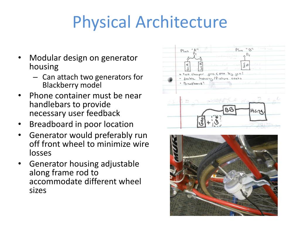 Physical Architecture • Modular design on generator housing • Can attach two generators for Blackberry model • Phone container must be near handlebars to provide necessary user feedback • Breadboard in poor location • Generator would preferably run off front wheel to minimize wire losses • Generator housing adjustable along frame rod to accommodate different wheel sizes