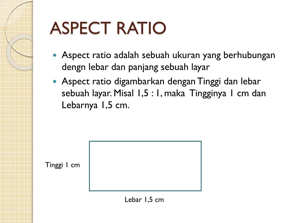 ASPECT RATIO • Aspect ratio adalahsebuahukuran yang berhubungandengnlebardanpanjangsebuahlayar • Aspect ratio digambarkandenganTinggidanlebarsebuahlayar. Misal 1,5 : 1, makaTingginya 1 cm danLebarnya 1,5 cm. Tinggi 1 cm Lebar 1,5 cm