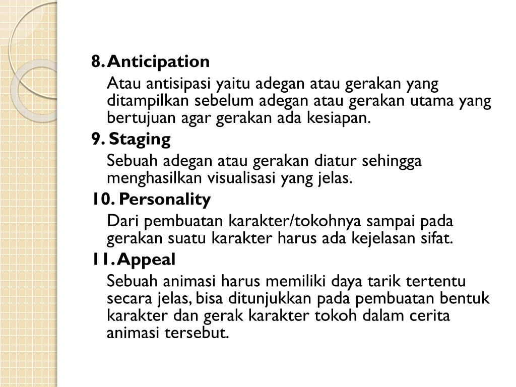 8. Anticipation Atauantisipasiyaituadeganataugerakan yang ditampilkansebelumadeganataugerakanutama yang bertujuan agar gerakanadakesiapan. 9. Staging Sebuahadeganataugerakandiatursehinggamenghasilkanvisualisasi yang jelas. 10. Personality Dari pembuatan karakter/tokohnya sampai pada gerakan suatu karakter harus ada kejelasan sifat. 11. Appeal Sebuahanimasiharusmemilikidayatariktertentusecarajelas, bisaditunjukkanpadapembuatanbentukkarakterdangerakkaraktertokohdalamceritaanimasitersebut.