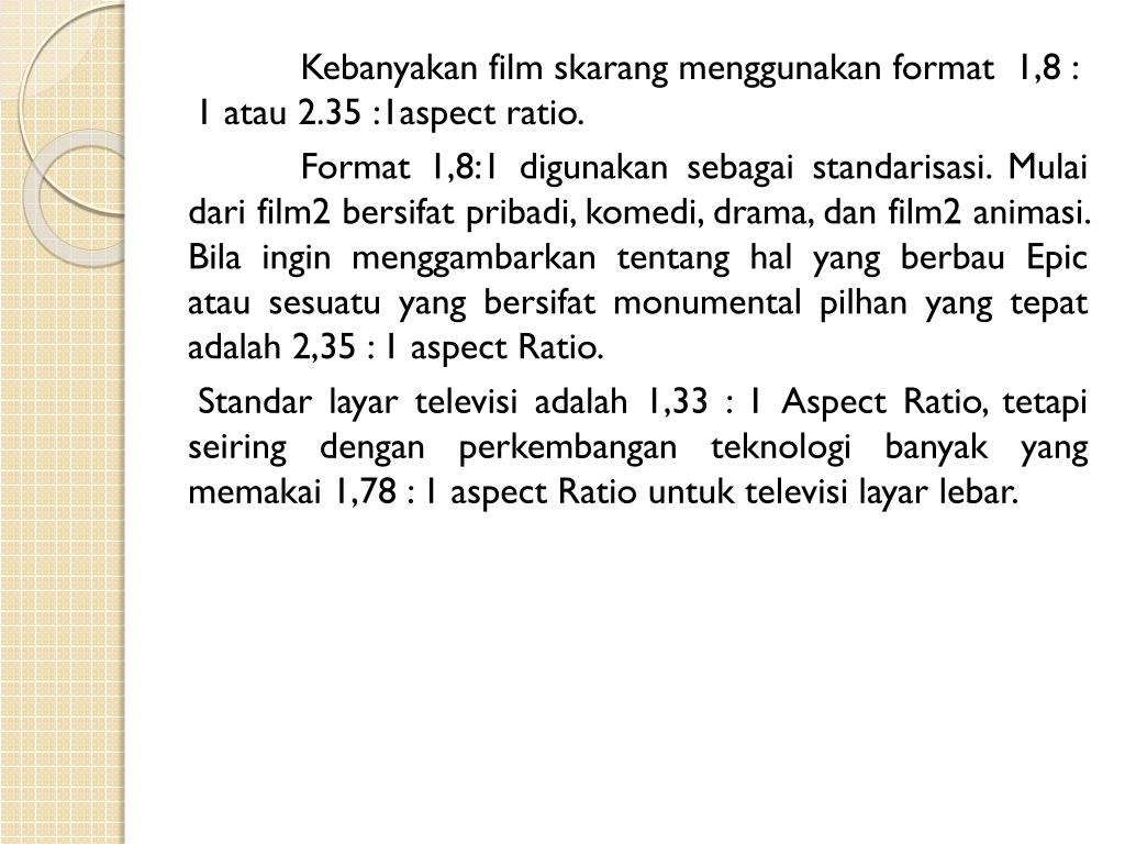Jenis-jenis Aspect Ratio Aspect Ratio TelevisiLayarLebar Standart Aspect Ratio (TV, LayarKomputer 1 1 1.78 : 1 1.33 : 1 1 1 1.85 : 1 1.66 : 1 Aspect Ratio Eropa Aspect Ratio Di Amerika (Film Konvensional)